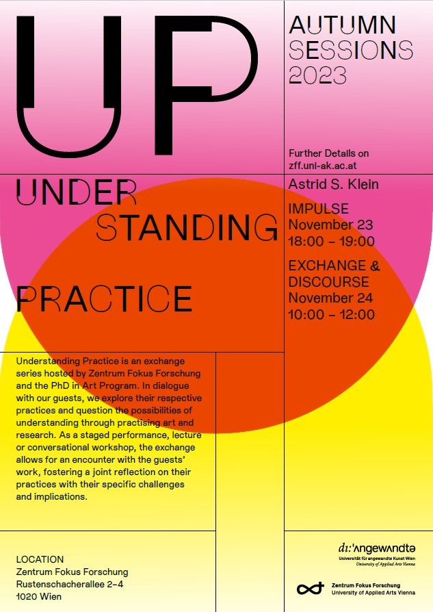 Klein is a master student of Joan Jonas. Her transdisciplinary practice encompasses poetic-critical analyses in different media and public event formats. She is the editor of crossing-boundaries-of-doubt.net and the initiator and artistic director of quartier flottant. She is a founding member of the Gesellschaft für künstlerische Forschung