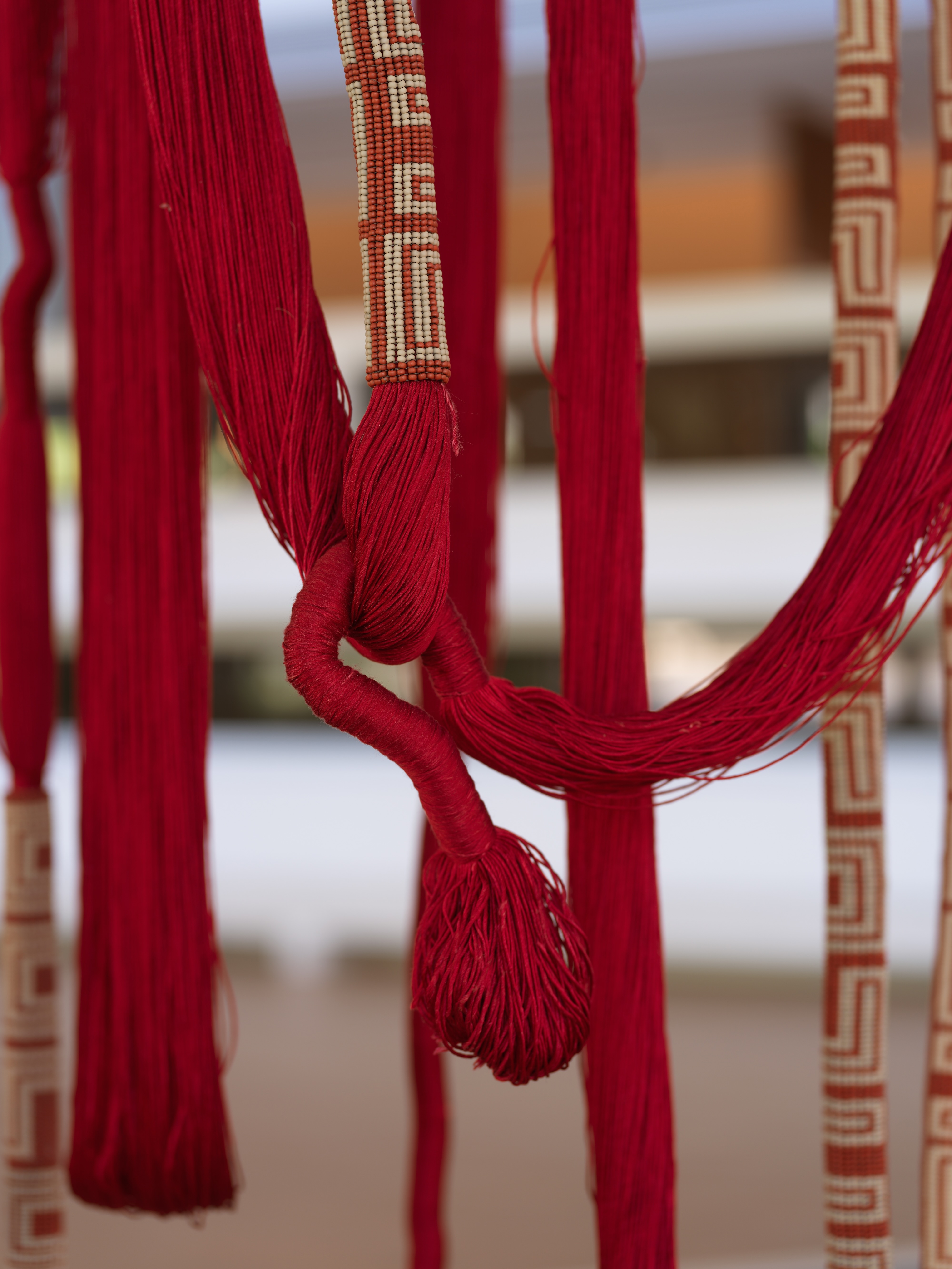 Interlocking strands of glass beads in geometric patterns, varying in colour, thickness and length, are interwoven with vertical white steel rods or narrow, elongated pieces of wood.