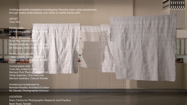 Sometimes the Goats Know the Way untersucht Tamales innerstädtische Peripherien anhand von Gedichten, die mit weißem Faden auf weißen Kente-Stoff gestickt sind. Entwickelt in der Hitze von Tamales offenen Stadträumen, entstand das Projekt durch Gehen, Zuhören und Feldaufnahmen, nachdem technische Geräte hitzebedingt ausfielen. Die Einschränkung wurde zur Methode.