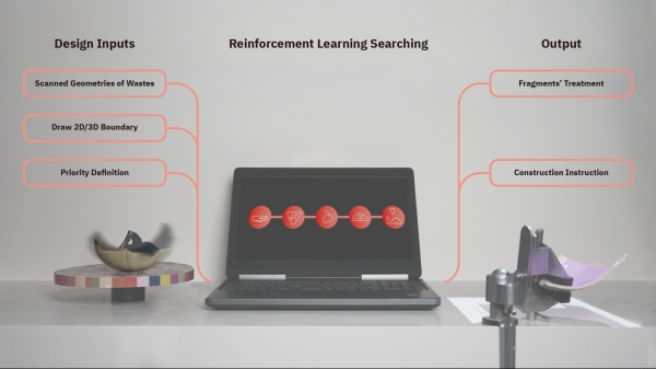 Chien-hua Huang setzt an der Standardisierung an, die in allen Branchen weitgehend gelebt wird. Das bringt erhebliche Vorteile für Wirtschaftlichkeit und organisatorische Effizienz, erzeugt aber aufgrund einseitiger Prozesse und homogener Inputs weitere Abfälle und Brachflächen. „Ein gewisses Maß an Flexibilität in der Normung, ein Gegenprozess, die ‚Entnormung‘ mittels künstlicher Intelligenz würde einen alternativen Workflow ermöglichen, der letztlich eine kreislauffähige Abfallwirtschaft umsetzbar machen könnte“, so der Designer.