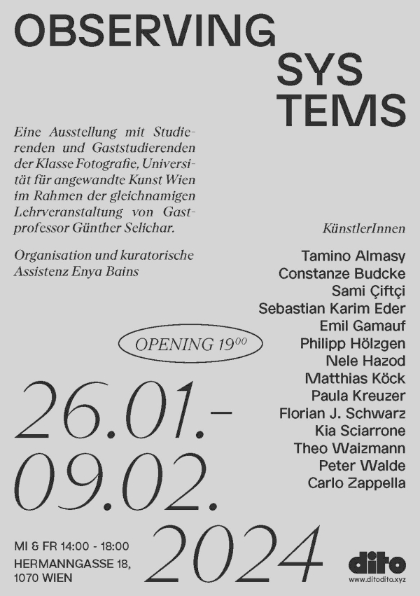 Eine Ausstellung mit Studierenden und Gaststudierenden der Klasse Fotografie, Universität für angewandte Kunst Wien im Rahmen der gleichnamigen Lehrveranstaltung von Gastprofessor Günther Selichar.